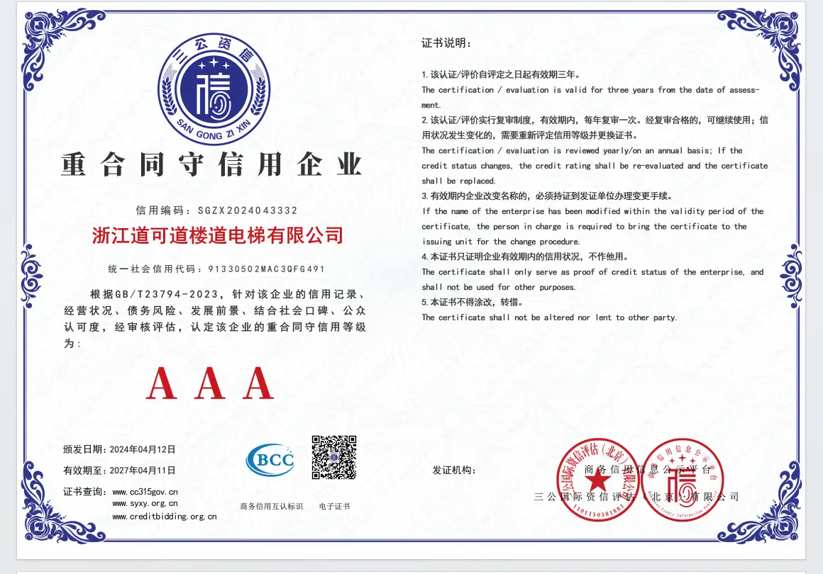 浙江道可道楼道电梯有限公司位于浙江省湖州市,作为一家集研发、生产、销售于一体的企业,优势显著。企业拥有强大技术研发实力,在研发过程中得到浙江大学、江苏科技大学、上海交通大学等高校导师技术指导。这使得其产品技术,能不断推陈出新,满足市场需求。产品类型丰富,涵盖直线翻版款、曲线旋转款等多种类型,满足不同场景需求。在服务方面,面向全国安装,配备专业服务团队,提供源头厂家售前售后全程贴心服务。凭借这些优势,浙江道可道楼道电梯有限公司在旧楼加装电梯领域树立了良好口碑,成为众多客户的靠谱选择,为老旧小区居民提供了优质、高性价比的电梯加装解决方案。